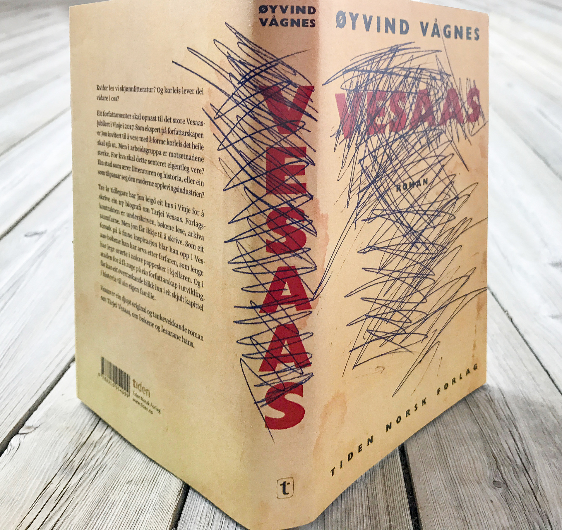 Dust cover for Øyvind Vågnes’ novel "Vesaas". Published by Tiden forlag, autumn 2017.